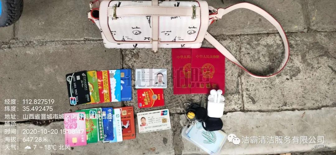 10月20日下午3點(diǎn)左右,晉城市潔霸清潔服務(wù)股份有限公司保潔部環(huán)衛(wèi)經(jīng)理李通和工人在城區(qū)南街街道景西路段進(jìn)行街道清洗作業(yè)時(shí),忽然看見晉城農(nóng)商銀行門前的綠化帶里有一個(gè)女士挎包,忙叫環(huán)衛(wèi)工人郭志云把挎包撿了起來(lái)。當(dāng)時(shí)就考慮到失主丟失挎包以后一定很著急,在同事的共同見證下他們打開挎包,經(jīng)過(guò)查看,發(fā)現(xiàn)挎包內(nèi)有一張王女士的身份證、社?般y行卡數(shù)張,還有結(jié)婚證、鑰匙、耳機(jī)、富士康工牌等物品。憑借富士康工牌上的工號(hào),他們給富士康打電話聯(lián)系到了失主,后由環(huán)衛(wèi)主管秦彩鳳將挎包交到失主手中。收到失而復(fù)得的挎包,王女士又驚又喜,感激萬(wàn)分。