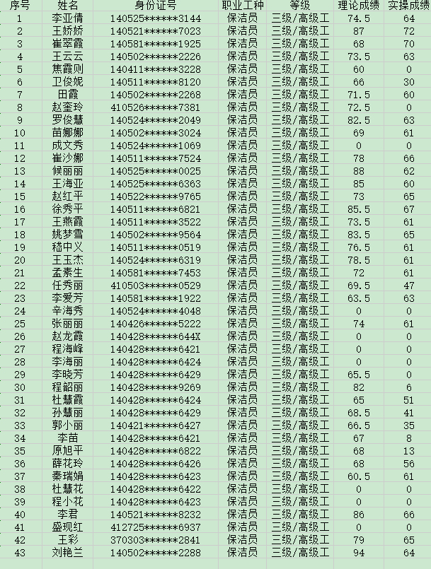 晉城市潔霸清潔服務股份有限公司職業(yè)技能等級認定中心2024年5月12日第12批保潔員高級認定人員成績公示
